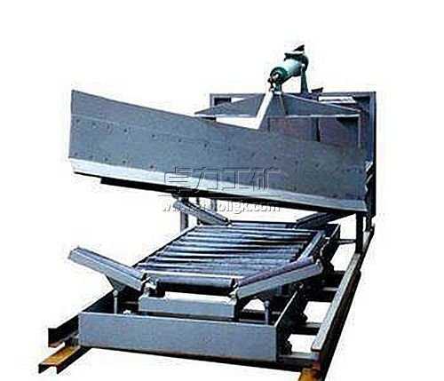 電液動犁式卸料器以電液推桿為動力源,工作時,通過推桿伸出作用于驅(qū)動桿, 帶動框架前進,完成犁刀下落,并支承起平托輥組,使膠帶工作面平直,犁刀下沿與膠帶面貼合緊密,將運行膠帶上的物料卸入漏斗(料斗)中,或卸到需要的場去。卸料完畢時,啟動電液推桿縮回作用于驅(qū)動桿, 帶動框架后退,犁刀上抬,可變槽角托輥組由平形變回槽形,使膠帶工作面恢復(fù)槽形狀態(tài),讓物料平穩(wěn)通過。