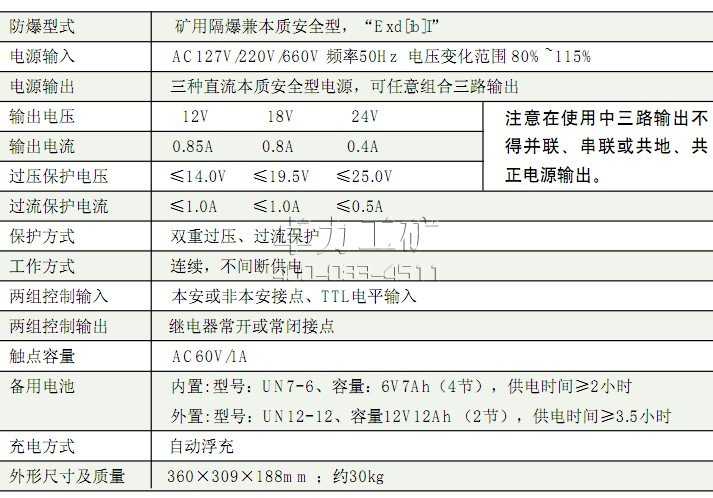 KDW17型電源是一種允許在外司煤塵爆炸危險(xiǎn)環(huán)境中使用的通用型隔爆兼本質(zhì)安全型不間斷電源,三路12V、18V、24V本安電源(可任意組合)輸出,并有兩組繼電器控制隔離輸出回路。用語(yǔ)向本質(zhì)安全型設(shè)備提供本安直流電源,同時(shí)可用語(yǔ)斷電控制。