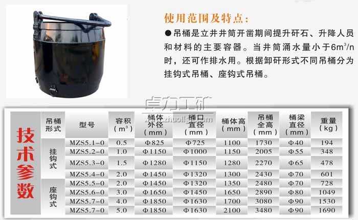 座鉤式吊桶需要配鉤頭裝置使用,礦用吊桶是立井井筒開鑿期間提升矸石、升降人員和材料的主要容器。