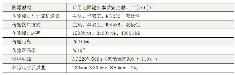 (以下簡稱傳輸接口)是一種礦用數(shù)據(jù)信息轉(zhuǎn)換傳輸裝置,是本公司KJ70N型監(jiān)控系統(tǒng)的主要配套設(shè)備。傳輸接口以微處理器為核心,按標(biāo)準(zhǔn)的MODBUS通訊協(xié)議為主干,并采用先進(jìn)、獨(dú)特的雙向切換技術(shù),傳輸數(shù)據(jù)格式為透明傳輸方式,傳輸過程中只須TXDRXD,GND三根數(shù)據(jù)線。傳輸接口分三組信號輸出,兩組為井下分站傳輸(本安),另一組為地面分站傳輸(非安)。傳輸接口本安傳輸采用高速光電隔離器將RS232信號與外部數(shù)據(jù)總線信號有效且可靠的隔離,這樣傳輸接口的可靠性顯著增強(qiáng),同時(shí)也延長了它的使用壽命。傳輸接口與KJ70N型監(jiān)控系統(tǒng)配合使用可實(shí)現(xiàn)雙機(jī)切換功能,同時(shí)傳輸接口提供一組非安DC18V/400mA調(diào)試電源(不得下井使用),為用戶在調(diào)試維修中提供方便。 主要技術(shù)指標(biāo)