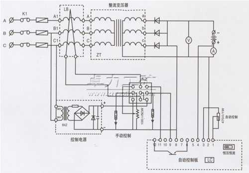 當(dāng)電網(wǎng)電壓波動(dòng)或負(fù)載波動(dòng)而引起輸出整流電壓波動(dòng)時(shí),通過(guò)改變飽和電抗器的電抗變化來(lái)達(dá)到穩(wěn)定電壓的目的.由于礦燈充電電流是一個(gè)變化量,而電網(wǎng)電壓也是一個(gè)變化量.這二個(gè)量的不斷變化,使礦燈充電電壓同時(shí)作相應(yīng)的變化,影響礦燈充電質(zhì)量,影響礦燈充電質(zhì)量,加入穩(wěn)壓裝置后這個(gè)變化量從輸出斷a b 二點(diǎn)取出,與控制器內(nèi)部的標(biāo)準(zhǔn)量進(jìn)行精密比較,再經(jīng) C 點(diǎn)輸出一個(gè)自動(dòng)調(diào)整的變化量.放大后自動(dòng)控制直流激磁電流的變化,使輸出電壓保持在整定值5±1%的范圍內(nèi),達(dá)到自動(dòng)穩(wěn)壓的目的.