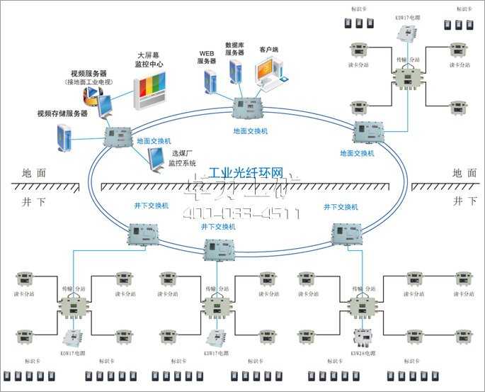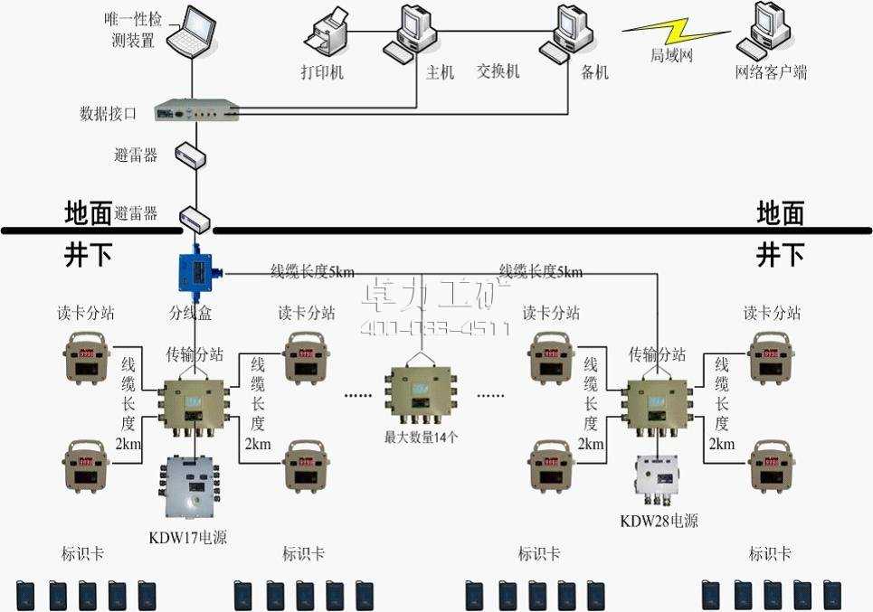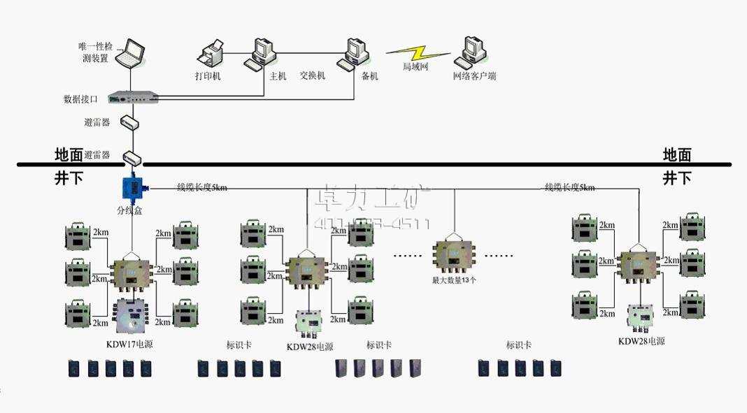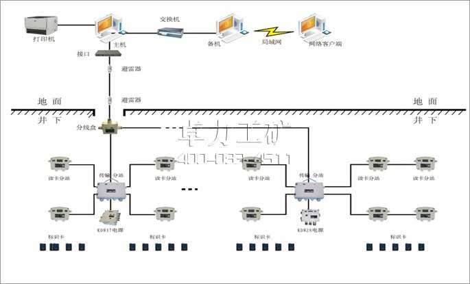 系統(tǒng)采用總線型網(wǎng)絡(luò)結(jié)構(gòu)。系統(tǒng)最多可接入16個(gè)傳輸分站設(shè)備(KJ128A-F型傳輸分站或KJ128A-F(A)礦用本安型傳輸分站);其中KJ128A-F型傳輸分站設(shè)備可接入KJ128A-F1讀卡分站1~4個(gè);其中KJ128A-F(A)礦用本安型傳輸分站設(shè)備可接入KJ128A-F1(A)礦用本安型讀卡分站1~6個(gè);系統(tǒng)最大可管理標(biāo)識(shí)卡不少于8000;供電電源:KDW17型礦用隔爆兼本安電源;KDW28-18型礦用隔爆兼本安不間斷電源,地面設(shè)備使用交流220V供電。