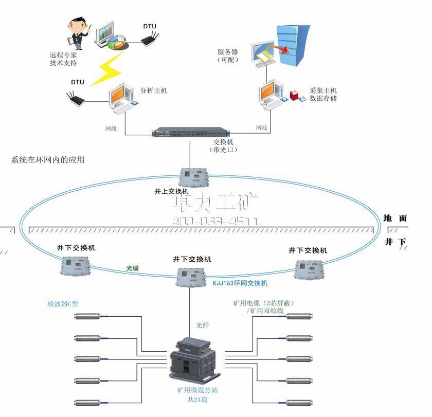 礦用微震系統(tǒng)由采集主機(jī)(服務(wù)器)、分析主機(jī)、交換機(jī)、信號傳輸設(shè)備(電轉(zhuǎn)光口設(shè)備、光纜、電纜、接線盒)、KJ699礦用微震監(jiān)測分站、拾震器GZC4.5A、環(huán)網(wǎng)交換機(jī)(地面交換機(jī))、UPS電源、服務(wù)器等組成。