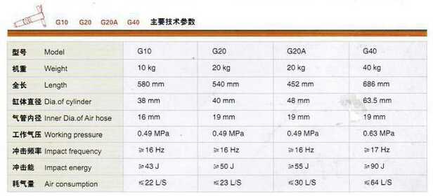G10.G20.G20A.G40風(fēng)鎬型號技術(shù)參數(shù)對照表