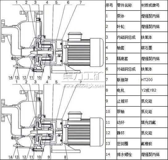 過流部件材質(zhì):PP(增強聚丙烯)、PVF2(聚偏二氟乙烯)